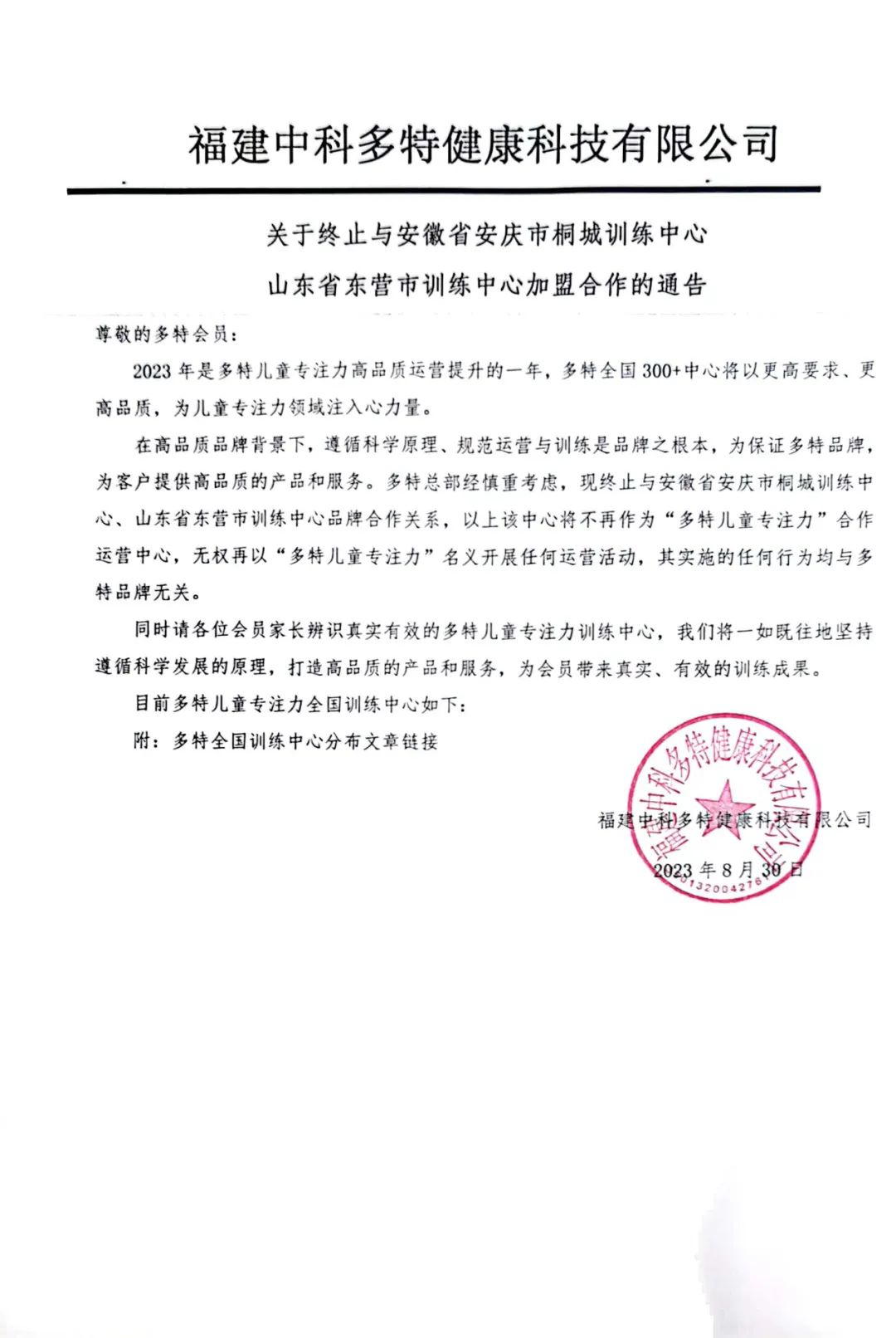 终止安徽省安庆市桐城训练中心、山东省东营市训练中心加盟合作通告